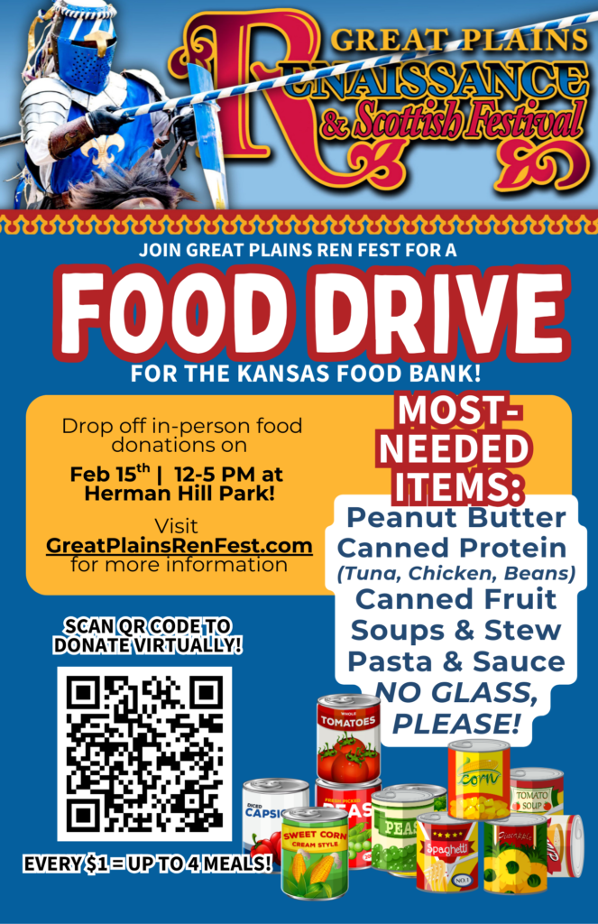 Donating money online to the Kansas Food Bank using the button below. For every $1 you donate they are able to provide 4 meals for Kansans in need. (All electronic donations are performed on Kansas Food Bank website, and The Great Plains Renaissance Festival is not involved in the transaction)
